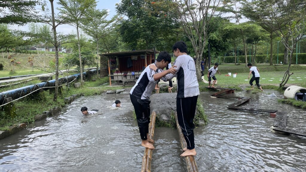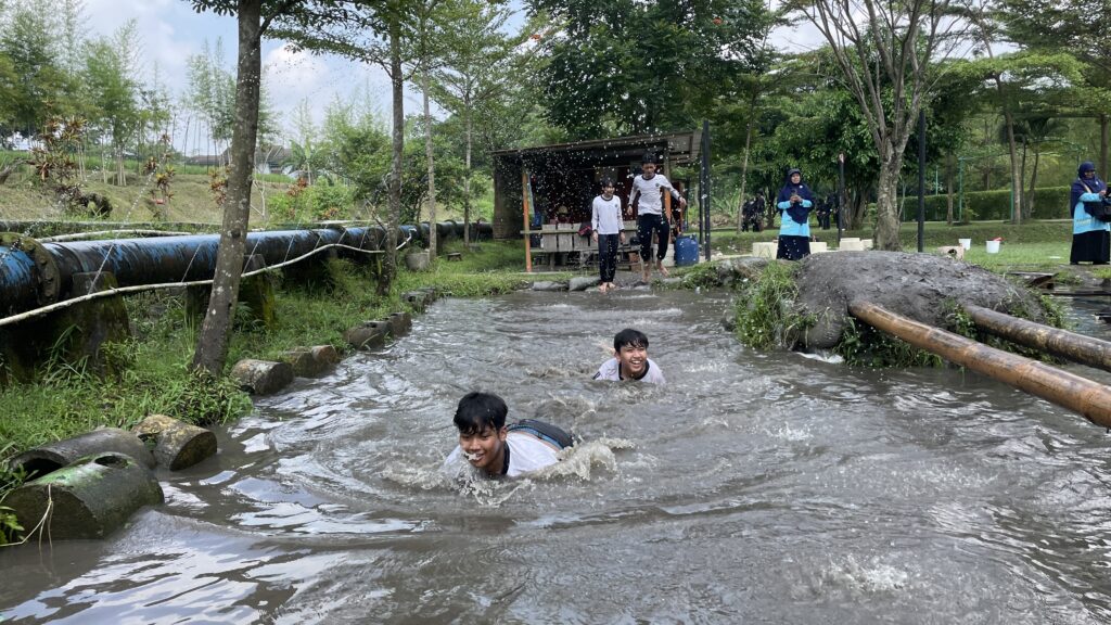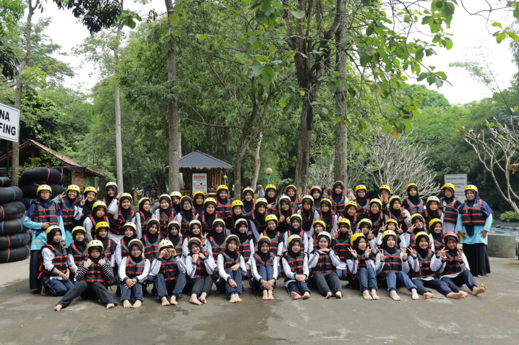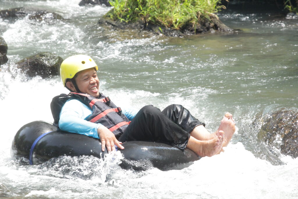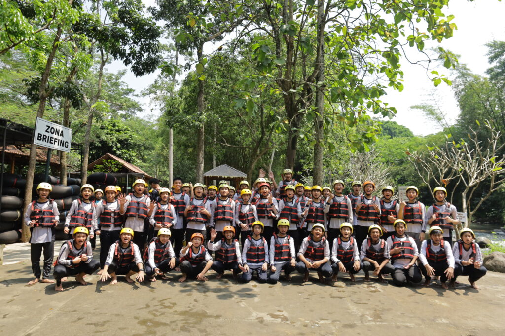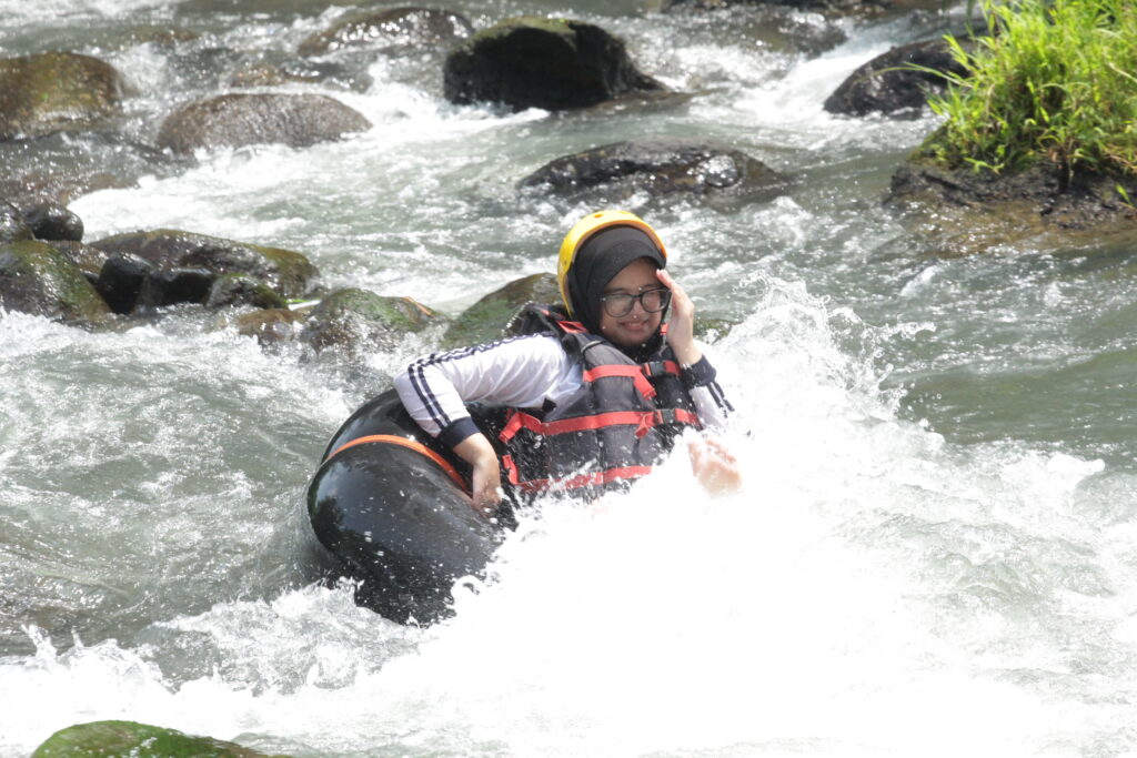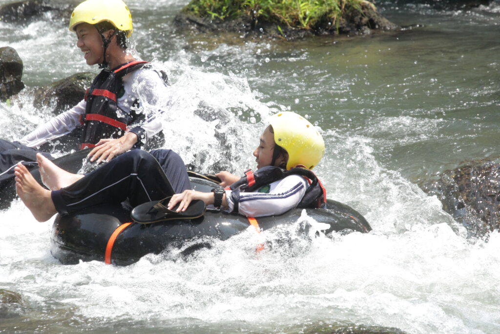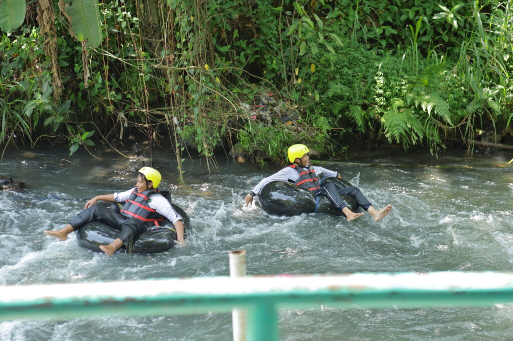 Tak berhenti di situ, adrenalin siswa semakin dipacu saat sesi river tubing. Di atas ban masing-masing, para siswa mengarungi derasnya arus sungai. Meski mendebarkan, raut wajah mereka justru menunjukkan keceriaan yang luar biasa. Canda tawa terdengar bersahutan di tengah cipratan air dan gelombang sungai yang menantang.